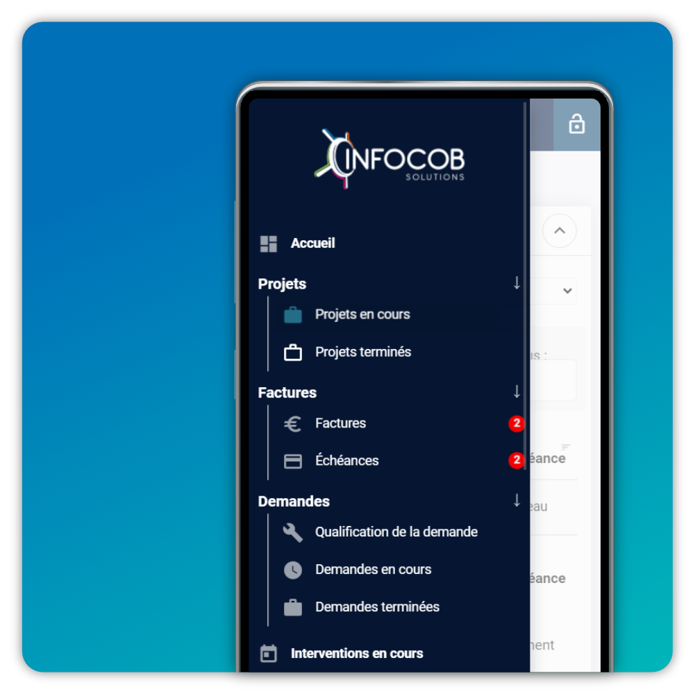 Nos espaces clients sont administrés depuis un backoffice dédié. Ce backoffice contient les informations que vous allez partager avec vos clients : interventions, contacts, fichiers… Vous avez la main pour le gérer au quotidien. Nous le connectons avec vos outils métier pour éviter les ressaisies.